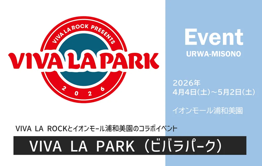 浦和美園の商業施設「イオンモール浦和美園」では、2026年4月4日(土)〜5月2日(土)の期間、「VIVA LA ROCK」と「イオンモール浦和美園」がコラボした、入場無料のコラボイベント「VIVA LA PARK(ビバラパーク)」が開催されます。