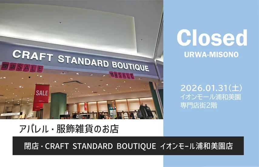 浦和美園の商業施設「イオンオール浦和美園」2階メンズアパレル・レディスアパレル・服飾雑貨「CRAFT STANDARD BOUTIQUE(クラフトスタンダードブティック)イオンモール浦和美園店」が2026年1月31日(土)をもって閉店します。