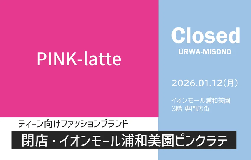 浦和美園の商業施設「イオンオール浦和美園」3階ティーン向けファッションブランド「イオンモール浦和美園 ピンクラテ」が2026年1月12日(月・祝)をもって閉店します。