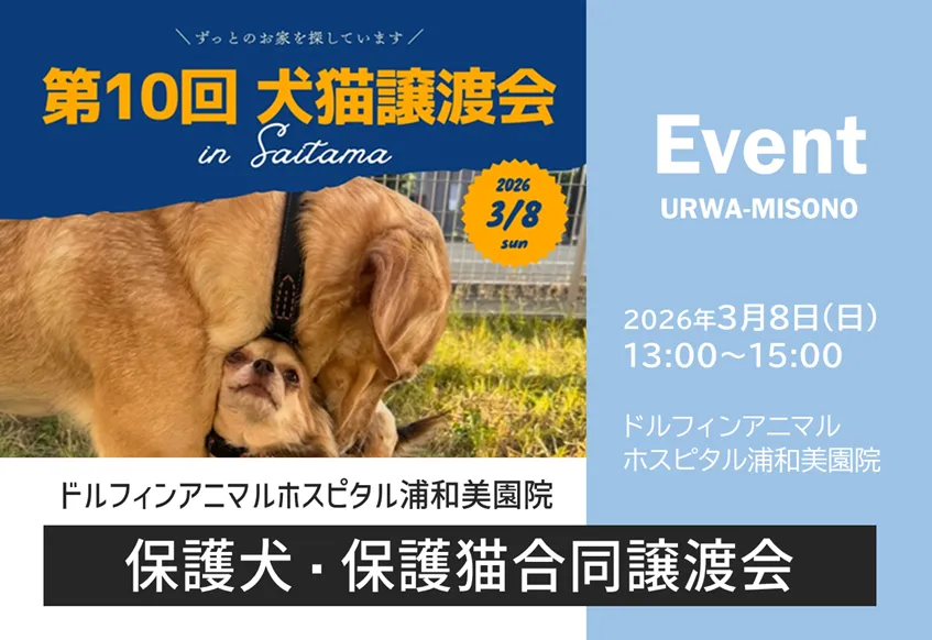 | 主 催 問合せ | ドルフィンアニマルホスピタル浦和美園院 TEL: 048-798-9912 FAX: - MAIL:- URL: https://www.dolphin-ah.co.jp/ |