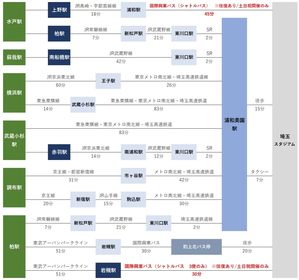 J1各チームホームスタジアムからの埼玉スタジアムまでの行き方