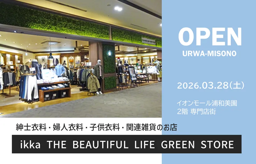 浦和美園の商業施設「イオンモール浦和美園」2階に、紳士衣料・婦人衣料・子供衣料・関連雑貨のお店「ikka THE BEAUTIFUL LIFE GREEN STORE イオンモール浦和美園店」が2026年3月28日(土)にオープンします。