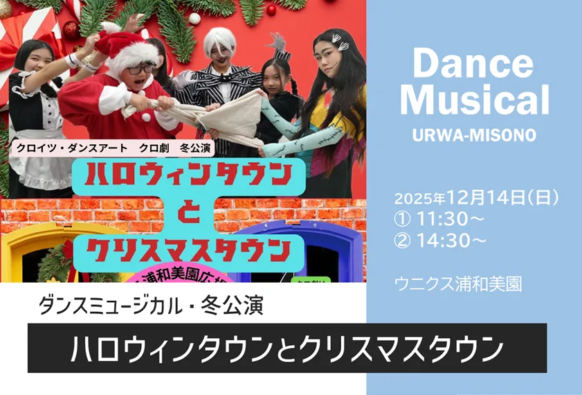 浦和美園の商業施設「ウニクス浦和美園」で2025年12月14日(日)に、冬公演「ハロウィンタウンとクリスマスタウン」を音楽とダンスで表現するダンス・ミュージカル公演が行われます。