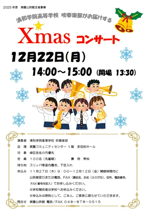 浦和美園東口徒歩2分にある「美園コミュニティセンター」で、2025年12月22日(月)に浦和学院高等学校吹奏楽部がお届けする「クリスマスコンサート」が開催されます。