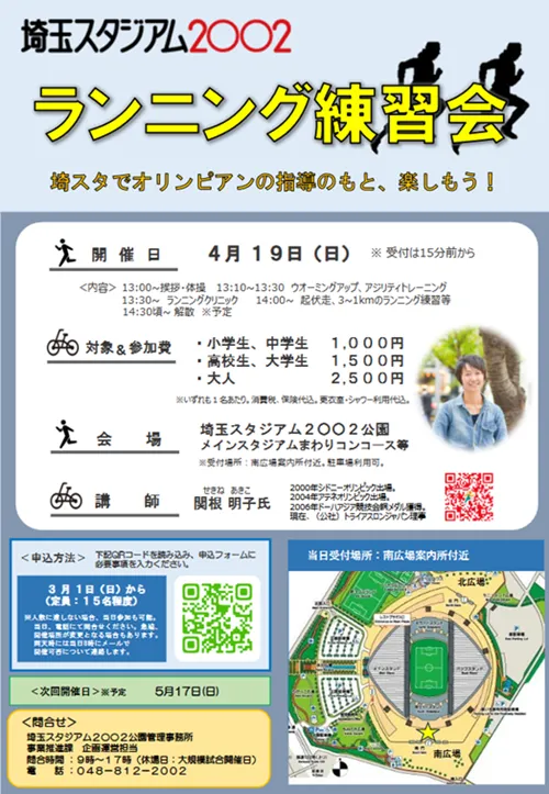 2026年4月19日(日)に埼玉スタジアム2002において、2000年シドニーオリンピック、2004年アテネオリンピックに出場された「関根明子」さんを講師に迎えた「埼スタランニング練習会」が開催されます。