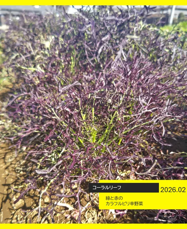 水菜風のフォルムのからし菜。緑と赤のコンストラストが美しく、食卓の彩りが増します。シャキシャキ食感を活かして、生のままのサラダがおススメ