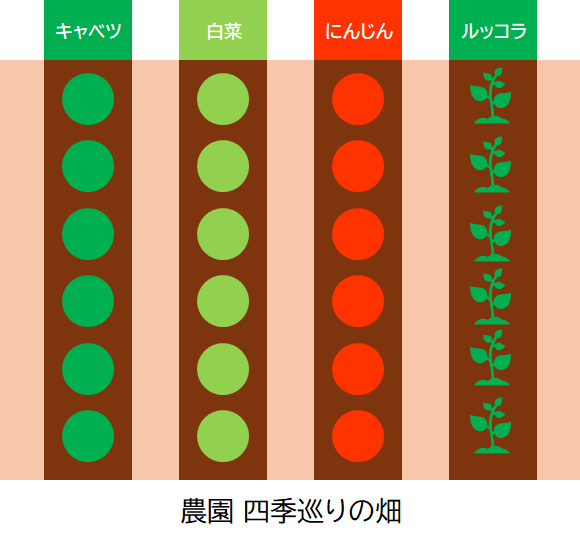 農園のイメージとして、夏はトマト、冬はキャベツなど期間中、ひとつかふたつくらいの野菜を育てるイメージですが、農園四季巡りさんが冬の期間だけでも10種類以上の野菜が収穫できるのには以下のような畑の計画が必要です。