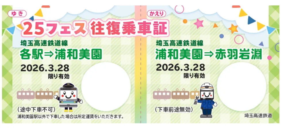 当社線各駅~浦和美園駅間(往復)を無料でご乗車いただける『25フェス往復乗車証』を配布します。
