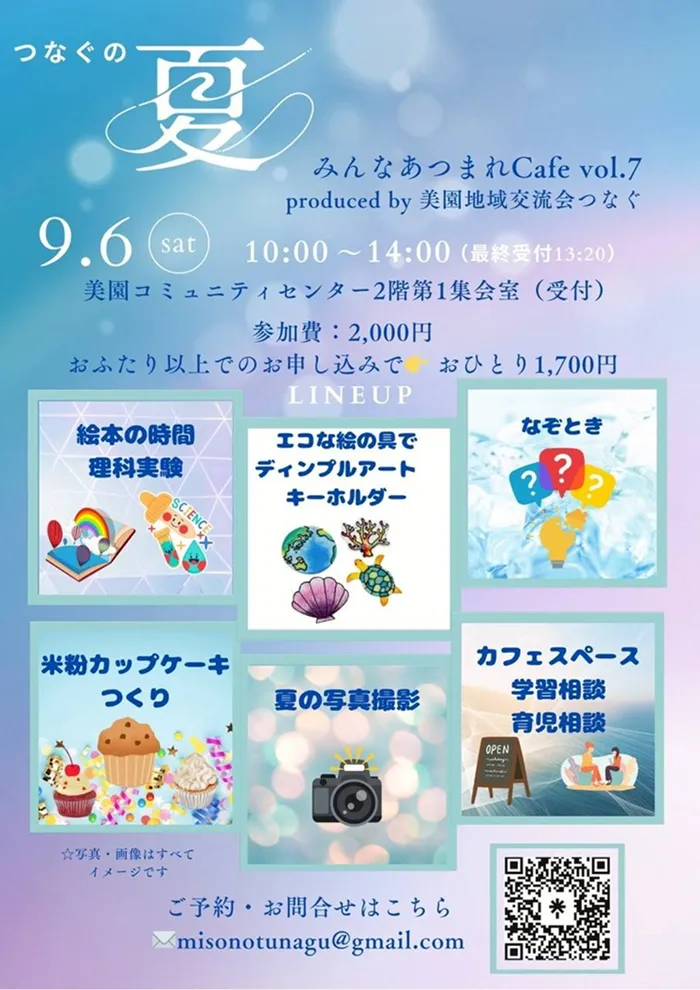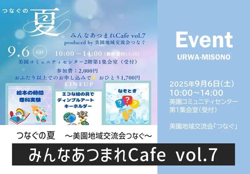 2025年9月6日(土)に、浦和美園駅東口から徒歩2分にあります美園コミュニティセンターで、美園地域交流会『つなぐ』が「みんなあつまれCafe vol.7」~つなぐの夏~を開催します。