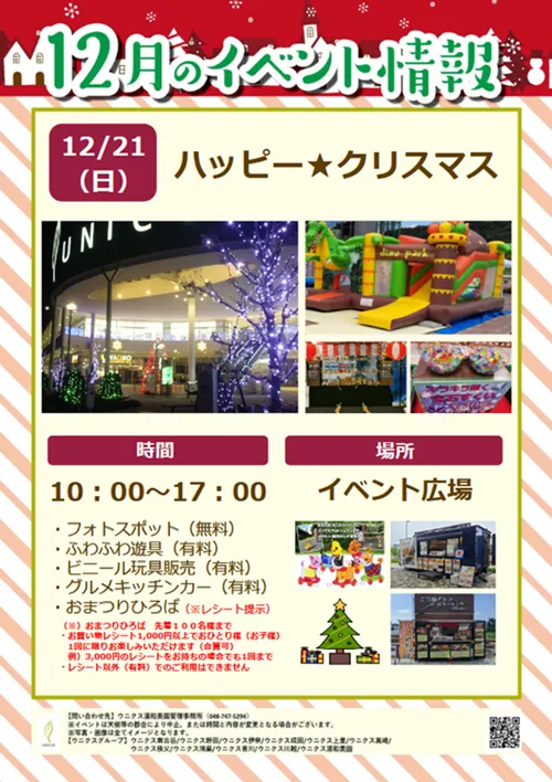 浦和美園の商業施設「ウニクス浦和美園」で、2025年12月21日(日)に「ハッピー★クリスマス」が開催されます。当日はふわふわ遊具、おまつりひろば、ビニール玩具販売や人気のキッチンカーも出店します。