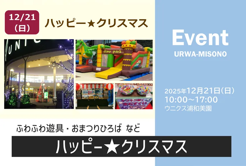 浦和美園の商業施設「ウニクス浦和美園」で、2025年12月21日(日)に「ハッピー★クリスマス」が開催されます。当日はふわふわ遊具、おまつりひろば、ビニール玩具販売や人気のキッチンカーも出店します。