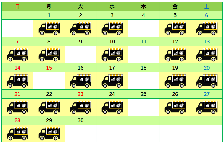 日付をクリックすると、各日の詳細な出店情報が見られます